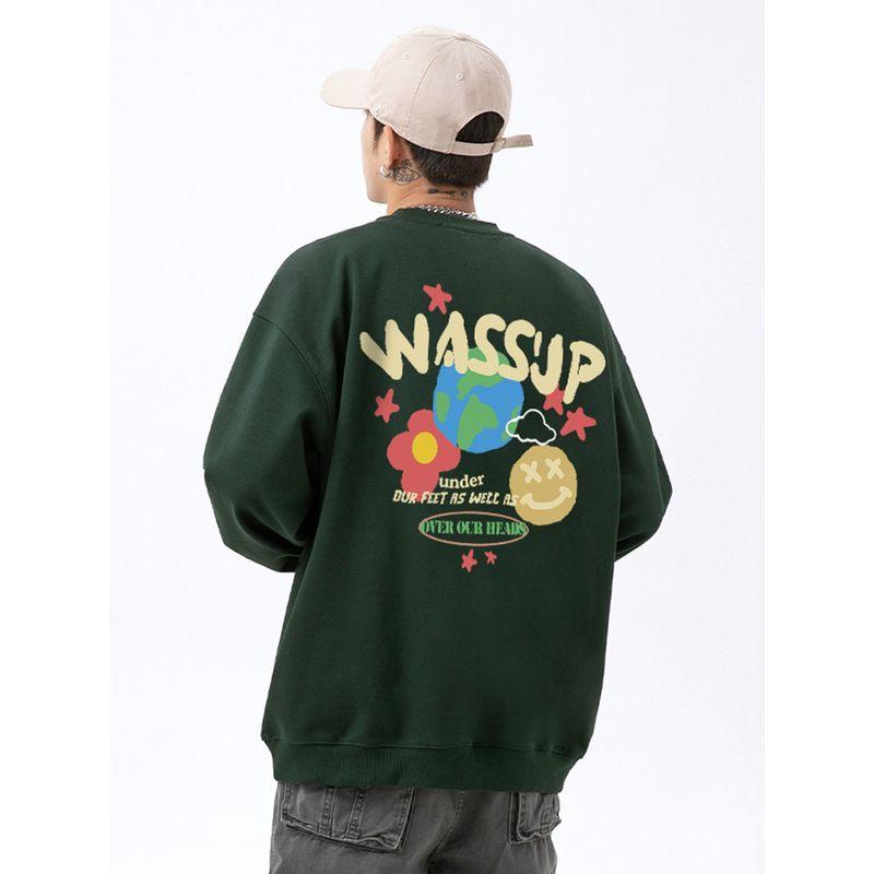 Wassup Trendy Brand Graffiti Smiley Face Earth Round-Neck Sweatshirt for Men, Spring and Autumn Heavyweight Versatile Couple Style American Top