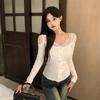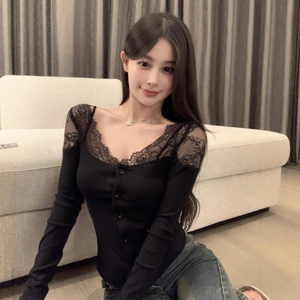 Lace splicing long-sleeved knitted sweater women's autumn and winter new sexy pure desire slim short inner