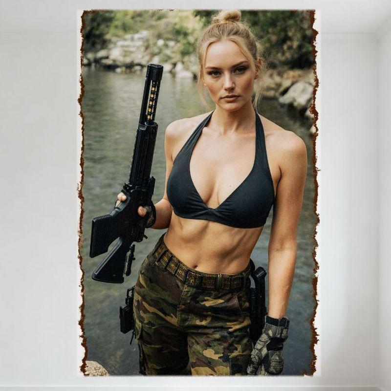 Sexy Blonde Frau mit Pistole Blechschild Vintage Metallposter für Heimbar Pub Dekoration, Rustikaler Retro Rand, 8x12 Zoll Metallwandkunst