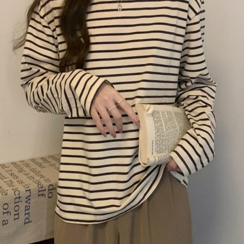 This Thin, Round-neck, Loose, Slimming, Versatile Long-sleeved T-shirt Is A Fashionable Striped Base Layer for Women in Autumn and Winter