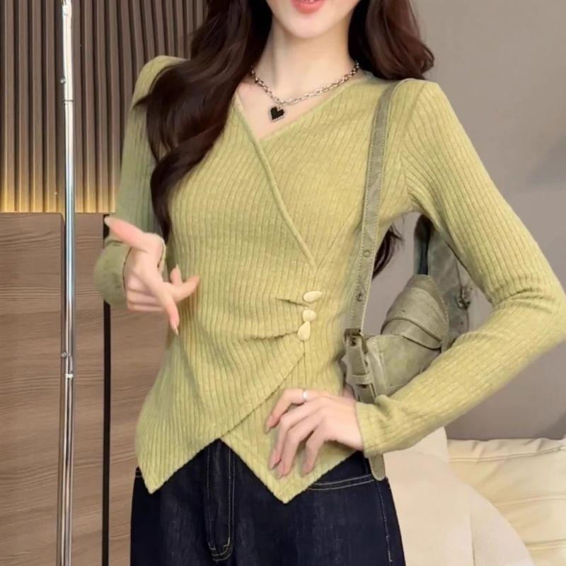 Ein unregelmäßiges grünes V-Ausschnitt Damen Übergrößen molliges Mädchen für Herbst und Winter, mit einem schlankmachenden und figurbetonten Basisschicht-Oberteil