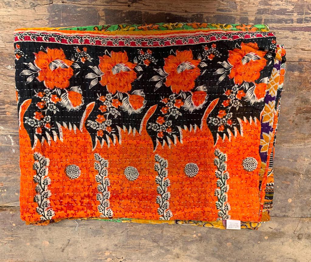 Floraler Kantha-Quilt: Handgenähte indische Gudari, Wendbare Baumwolldecke (94x68 Zoll