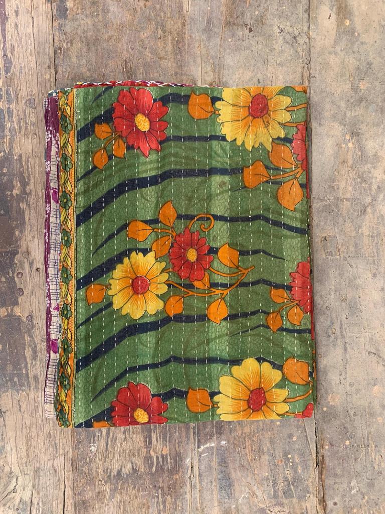 Wrap yourself in comfort and culture with this handcrafted 100% cotton sari quilt, also known as a Gudari. Lovingly made from up cycled vintage saris, each quilt is a work of art—featuring layers of soft cotton fabric hand-stitched with delicate Kantha. This lightweight reversible quilt can be used year-round and is perfect as a bedspread, throw blanket, picnic rug, or wall hanging. Every piece carries stories of India’s textile heritage, making it not just a cozy home accessory but a meaningful addition to your decor.