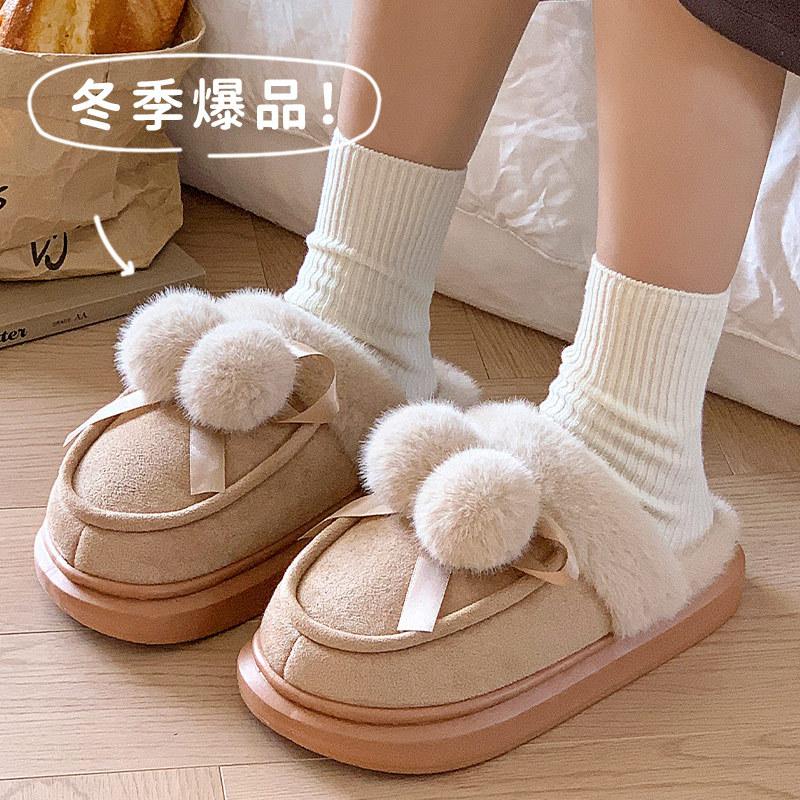 Winter neue Doppel-Puschel Schleife Plüsch Baumwollpantoffeln für Zuhause drinnen süße und modische Damenschuhe und Baumwollschuhe