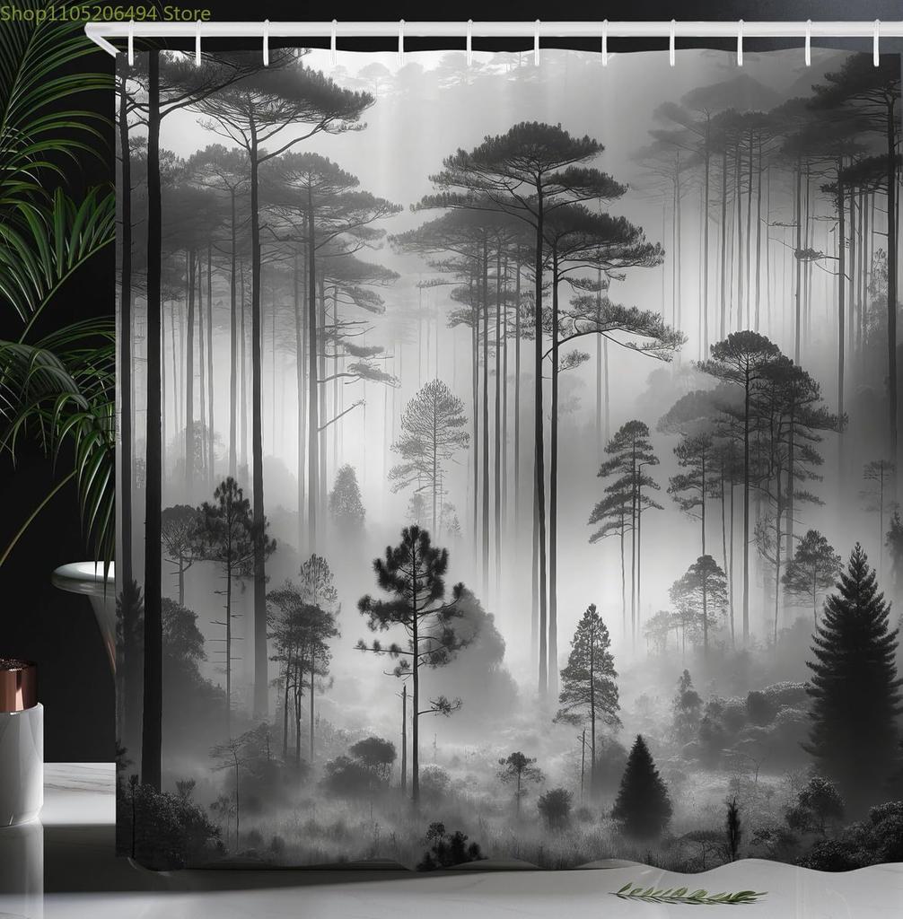 Schwarz-weißer Duschvorhang neblige hohe Bäume Wald natürliche Landschaft Stoff Badezimmerdekoration Duschvorhang mit Haken
