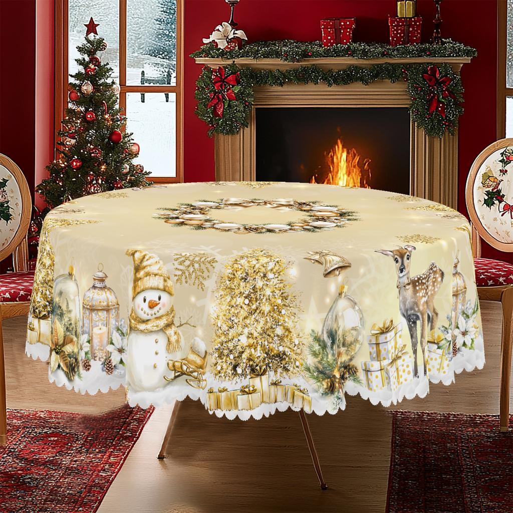 1 Stück Tischdecke mit fröhlichem Weihnachtsthema, goldfarben bedruckt, mit Schneemännern, Rentieren, Weihnachtsbäumen und Kranzmotiven, geeignet für Weihnachten, N
