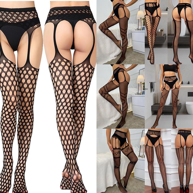 Black Stripe Sexy Stockings With Garter Belt Elastic Tights Erotic Lingerie Women High Fishnet Pantyhose Open Crotch Stockings