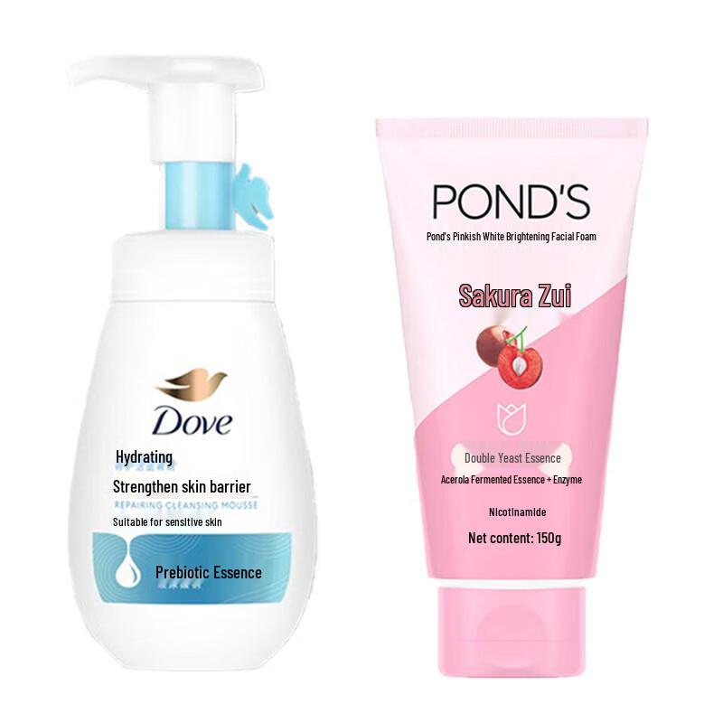 This skincare set combines Pond's Cherry Blossom Pink Hydrating Brightening Facial Cleanser (150g) and Dove Moisture Repair Brightening and Stabilizing Cleansing Foam (160ml). Designed for various skin types, this domestic, fragrance-free, non-special cosmetic duo helps cleanse, hydrate, and brighten your skin.