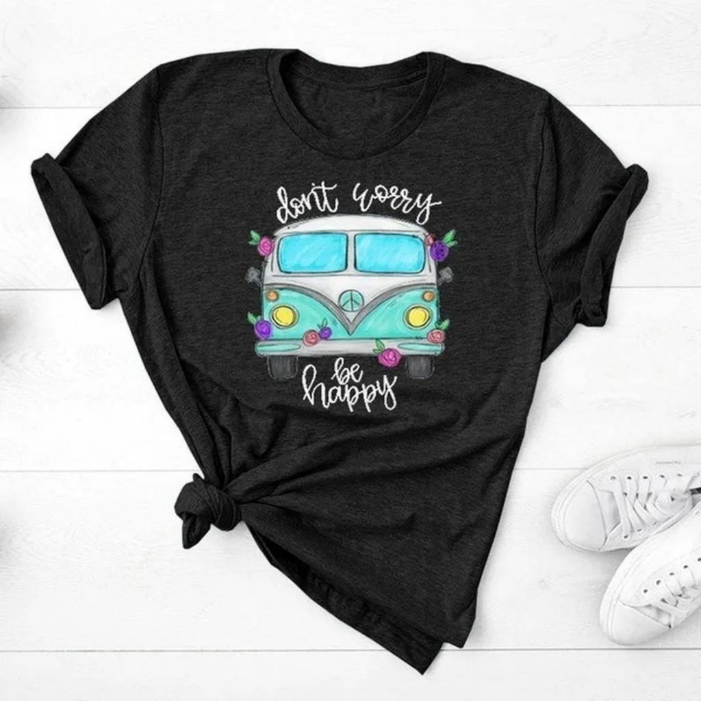 Be Happy Bus Print T-Shirt Frauen Kurzarm O-Ausschnitt Lose T-Shirt Sommer Frauen T-Shirt Tops Camisetas Mujer