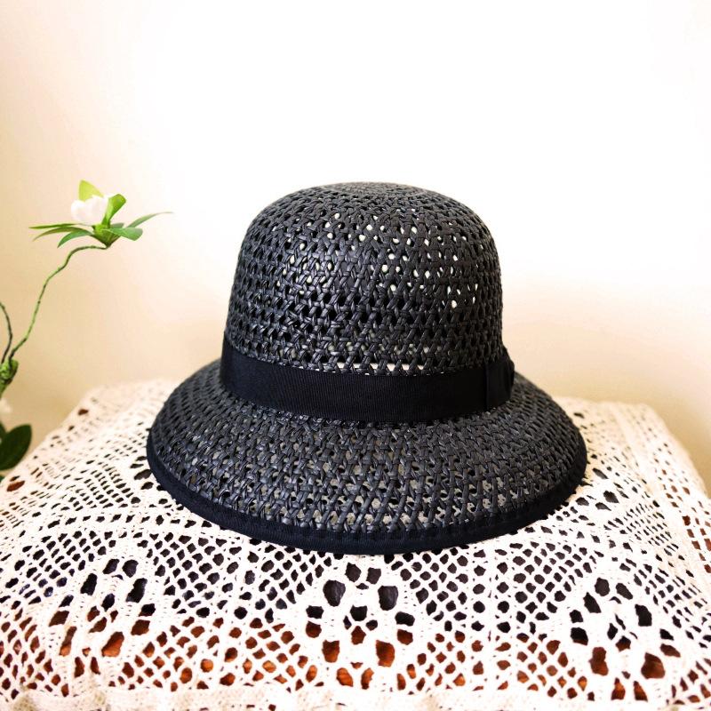 French Elegant Retro Black Hepburn Bell Hat Woven Straw Hat Women'S Summer Shade Resort Beach Fisherman Top Hat