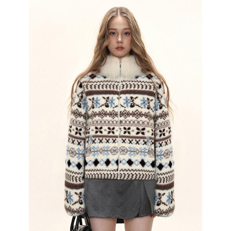 Shiyiyue Fair Isle Fur Collar Coat for Women, Autumn and Winter Vintage Loose Furry Thickened Slimming Warm Top