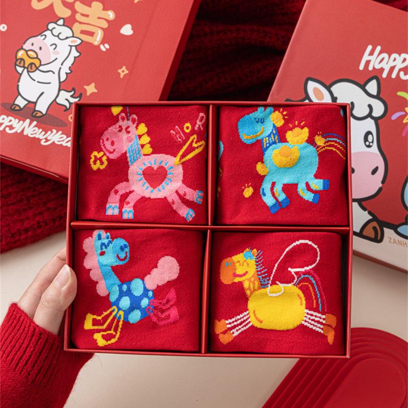 Red Socks, Year Of The Horse Cotton Socks, New Year'S Red New Year Socks, Cute Medium Gift Box Socks