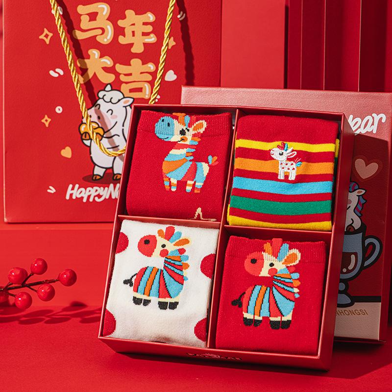 Geschenkbox Rote Socken Reine Baumwolle Mittelhohe Socken Saison Niedlich Cartoon Jahr des Pferdes Große Rote Strümpfe Frauen