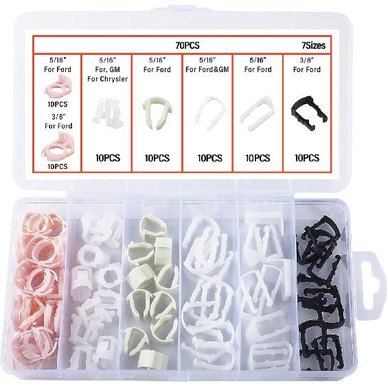 【Wide Range of Compatibility】:The fuel line kit has has a wide range of compatibility, suitable for 3/8" fuel lines, also can be used to replace 5/16" fuel line clamps, different sizes for different brands of vehicles, compatible with Ford, GM, Chrys, accurate replacement of broken fuel line clips. This is the perfect replacement fuel hose retainer clips car accessories that you must have!
