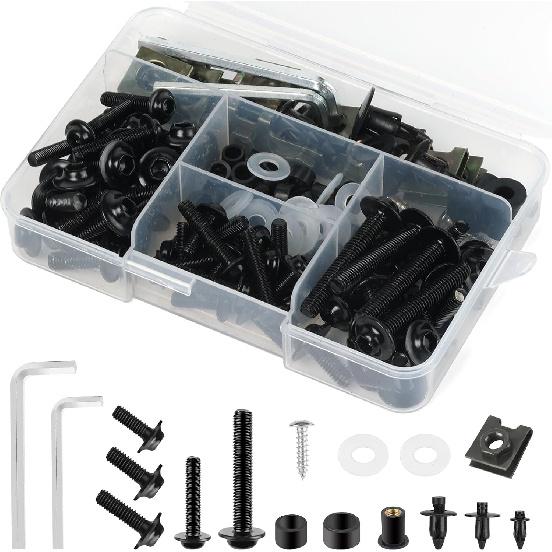 Complete Fairing Fastener Set - 195pcs fairing bolt screw kit includes screws, grommets, nuts, bolts, washers, clips, and M5/M6 Allen wrenches for hassle-free assembly. Made from high-strength stainless steel with a oxidized-black finished for rust resistance, durability, and a sleek look