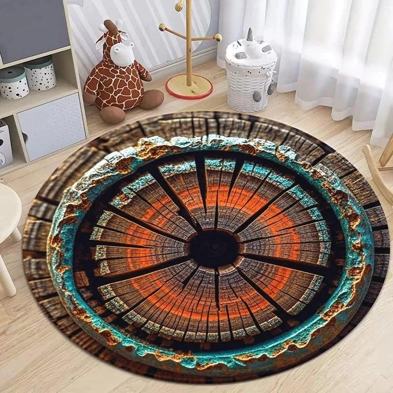 Natural Retro Tree Ring Slice Round Rug Collection Colorful Wood Grain Pattern Carpet For Living Room Kids' Room Decor
