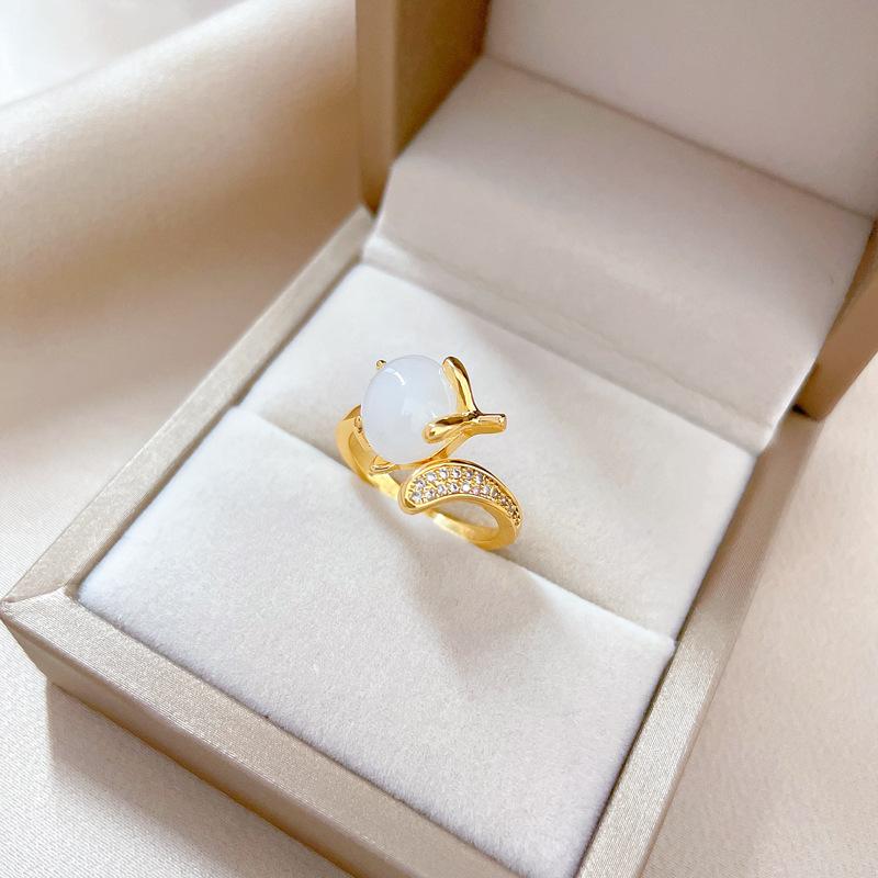 Echtgold, Weißjade, Fuchs Zirkon Ring, Verstellbare Öffnung, Einfacher Schmuck, Japanischer Ring, Partnerring