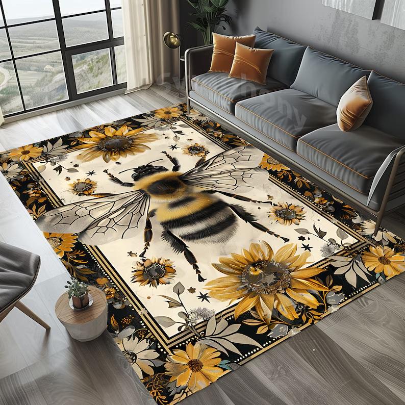 Bee and Sunflower Rug Traditional Floral Garden Design Christmas Living Room Carpet Home Decoration