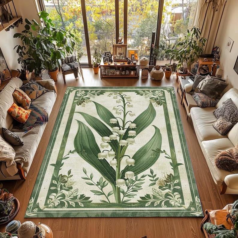 Vintage Lilienpflanzen-Teppich Wohnzimmer Schlafzimmer Vintage Grüner Randteppich Luther Pflanze Vollteppich Heimdekoration