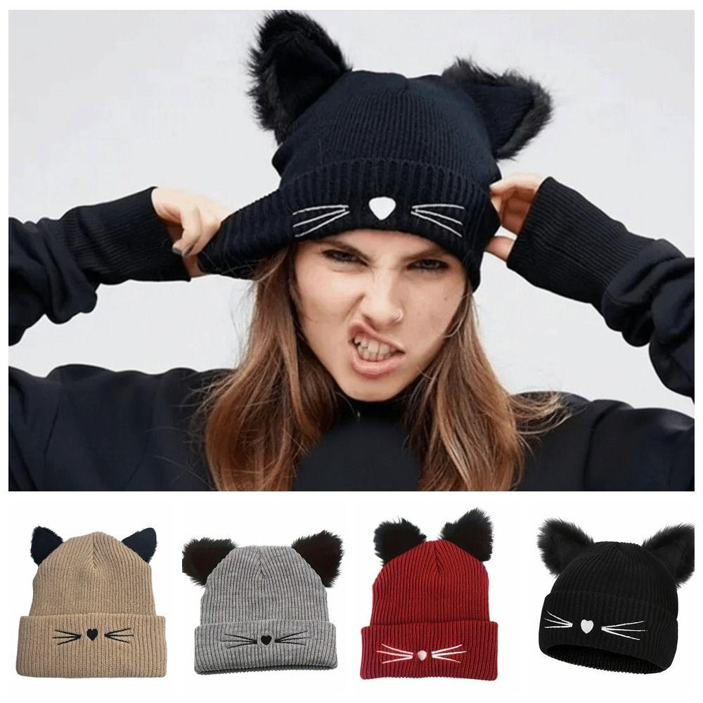 Einfarbige Katzenohren Mützen Wolle Kaltmütze Lässige Strick-Pullovermütze Mädchen