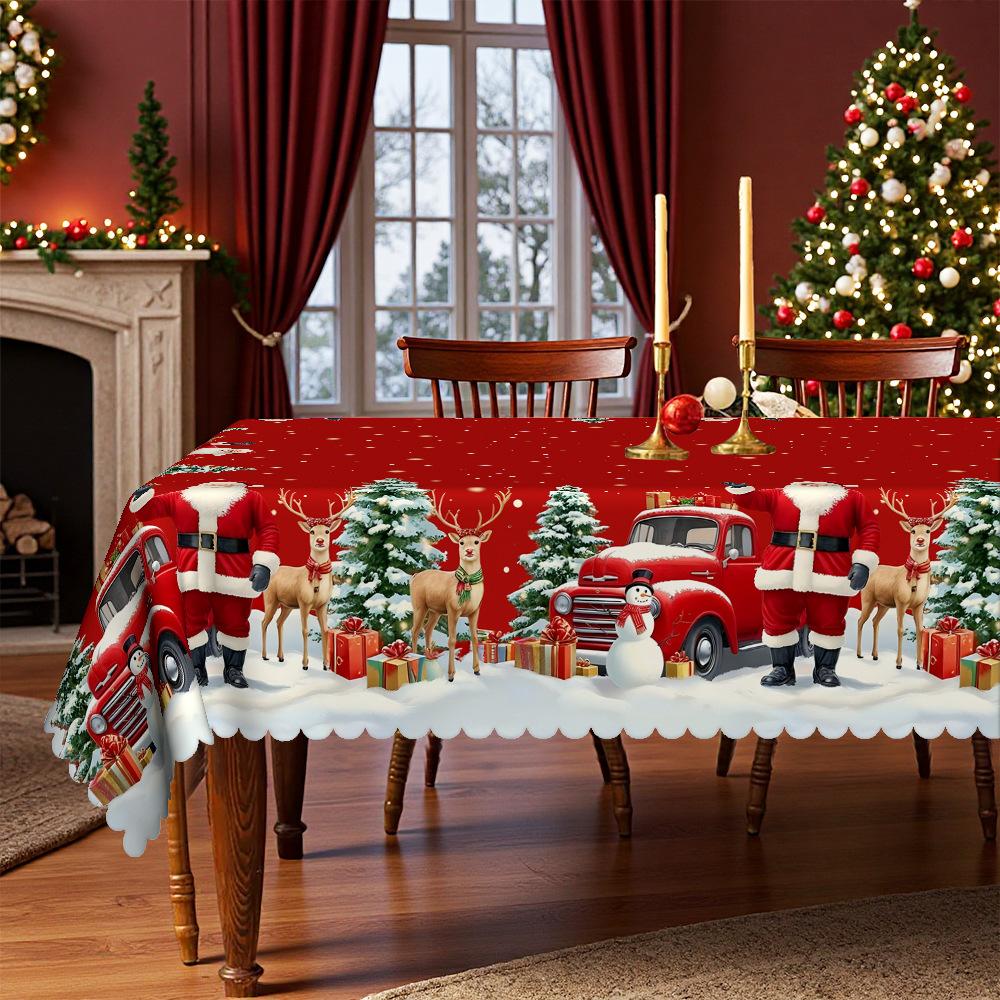 Christmas Tablecloth, Snow Santa Reindeer Sleigh Gift, Red Holiday Tablecloth, Restaurant Tablecloth