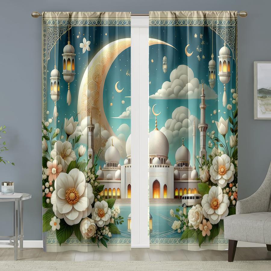 2 Stück Elegante Islamische Moschee & Laternen Vorhänge, Ideal für Ramadan/Eid Fensterdeko, Tunnelzugvorhänge