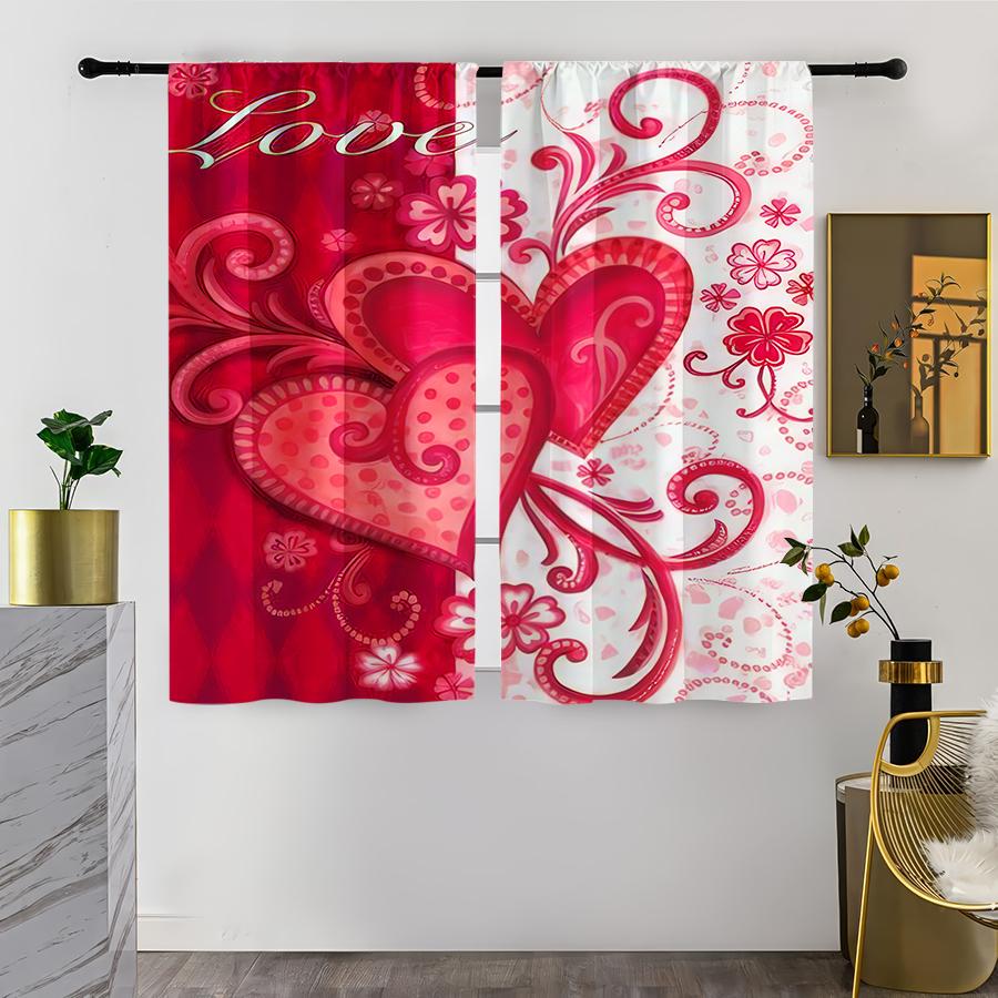 2PCS Red and White Love Curtains, Romantic Style, Bedroom and Living Room, Drawbar Pocket Decorative Curtains