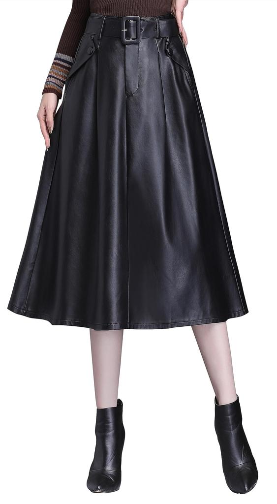 Syvent Langes PU-Leder mit und Faux-Ausgestelltem Rock Damen Herbst/Winter Rock, A-Linie, Leder, Gürtel, Knöpfe, Leder,