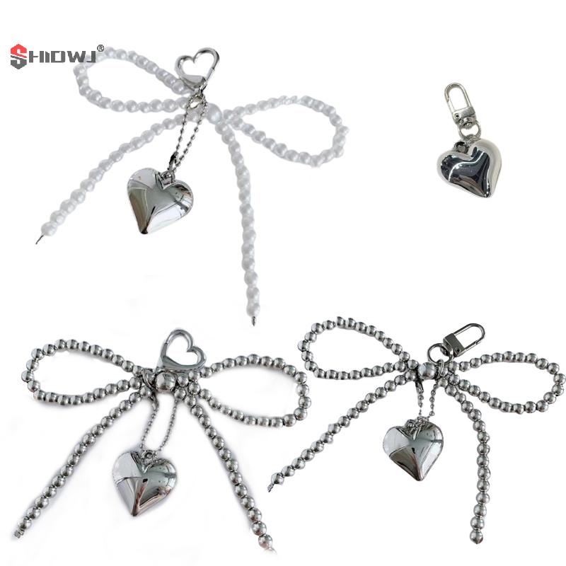 1Pc Pearl Bowknot Heart Pendant Keychain Beaded Phone Charm Detachable Bows Lanyard Handmade Keyring Jewelry For Bag Purse