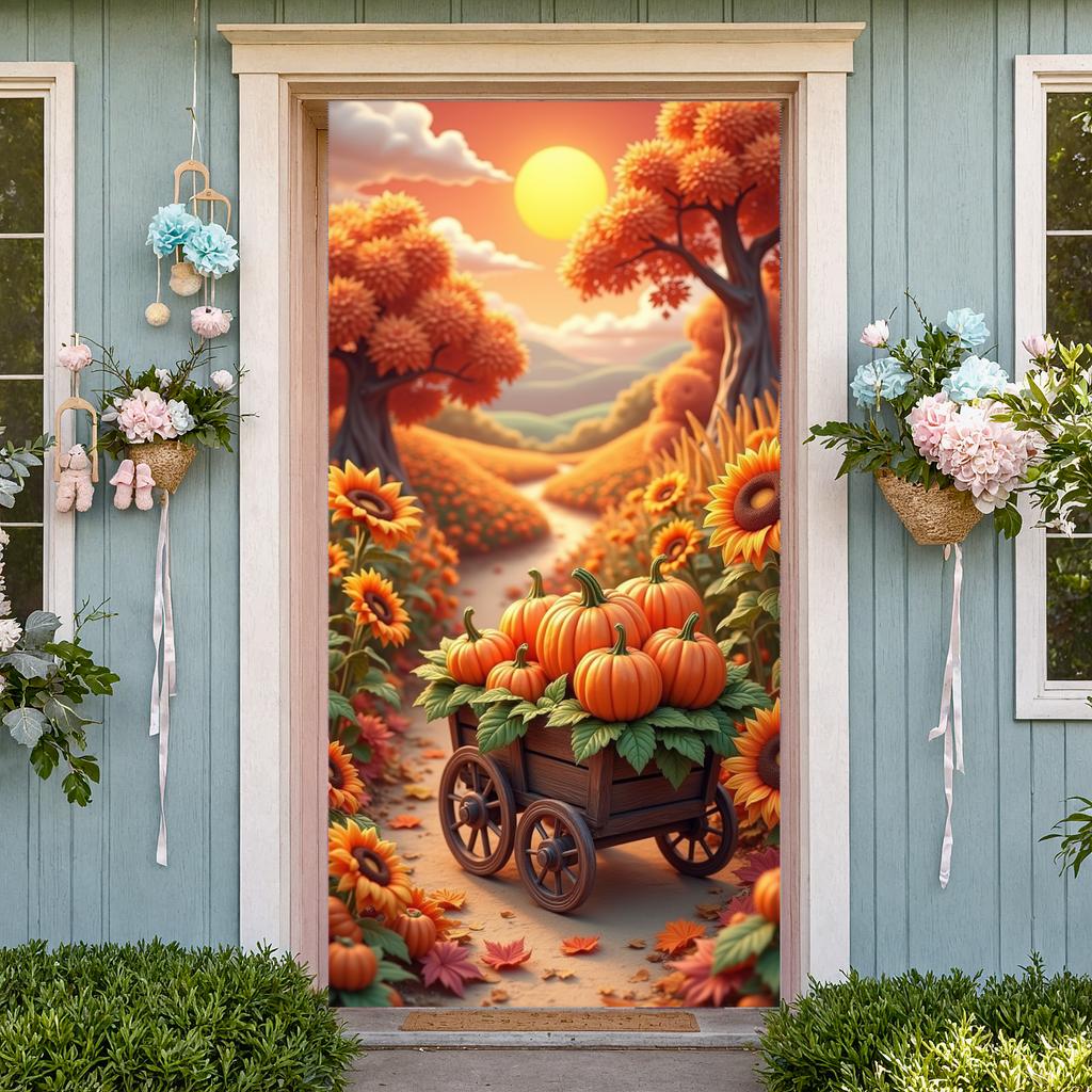 Outdoor Decor Pumpkin Cart Seasonal Banner Sunflower Decor Wooden Cart Pumpkin Design For Halloween Party Seasonal Decor