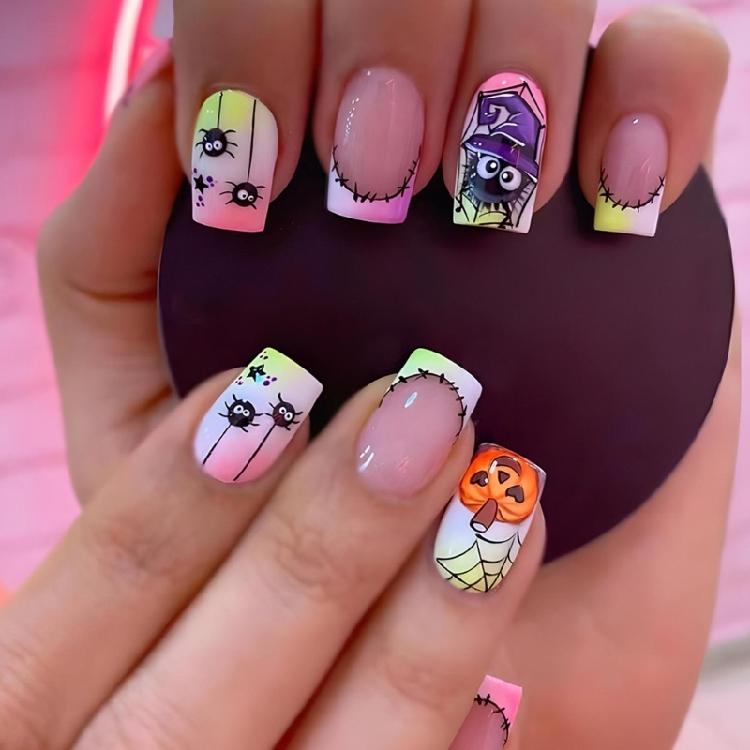 Künstliche Nägel Quadratisch Französische Spitzen Falsche Nägel Acrylnägel Spinnen Aufkleber Nägel für Damen Halloween Press-on Nägel Damen