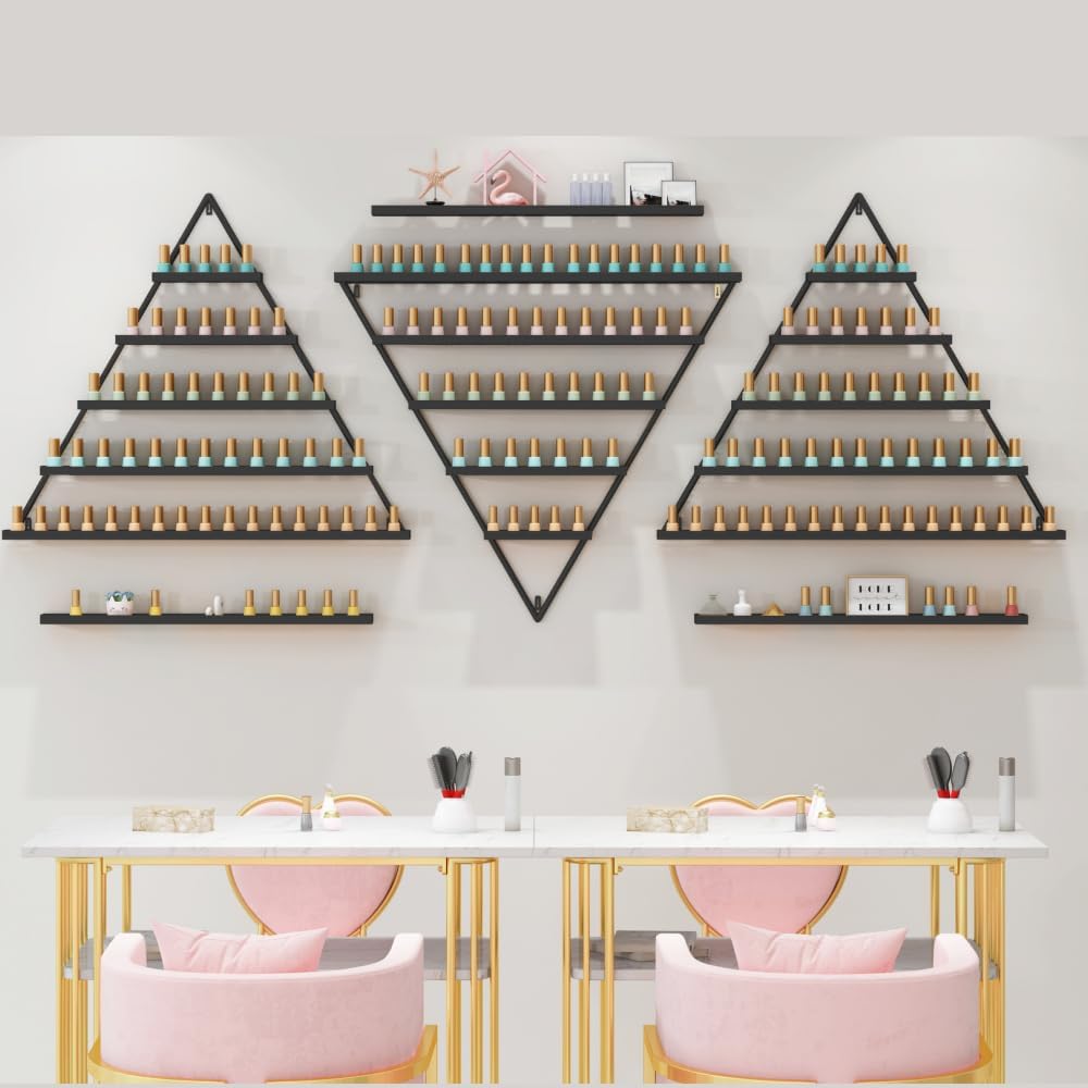 Elegant Gold Wall Mounted Nail Polish Rack - Set of 6 Triangular Cosmetic Display Shelves for Essential Oil Bottles, Organize Your Lipsticks and