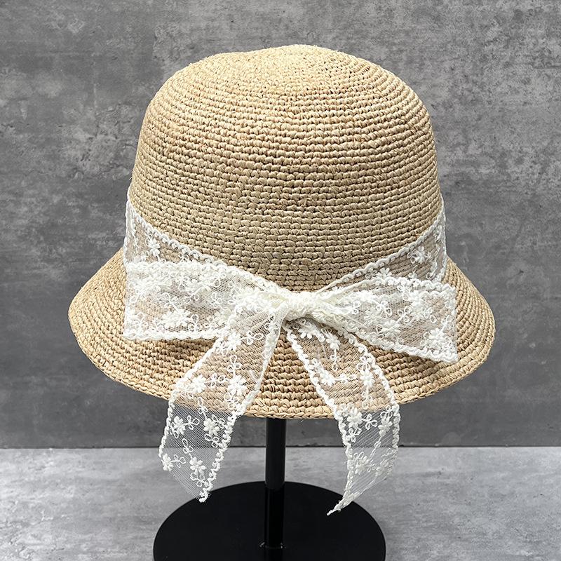 Lace Bow Short Brim Raffia Sunscreen Hat Women'S Hand Knitted Bucket Hat Summer Outing Sunshade Straw Hat