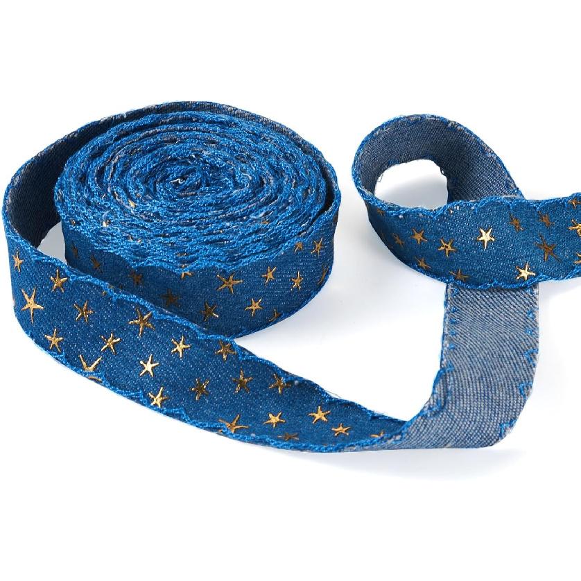 5 Yards Marine Blue Gold Foil Star Denim Ribbon for Clothes Accessories,3D Star Gold Stamping Jean Cloth Fabric Ribbon, 1 Inch Denim Cloth Ribbon for