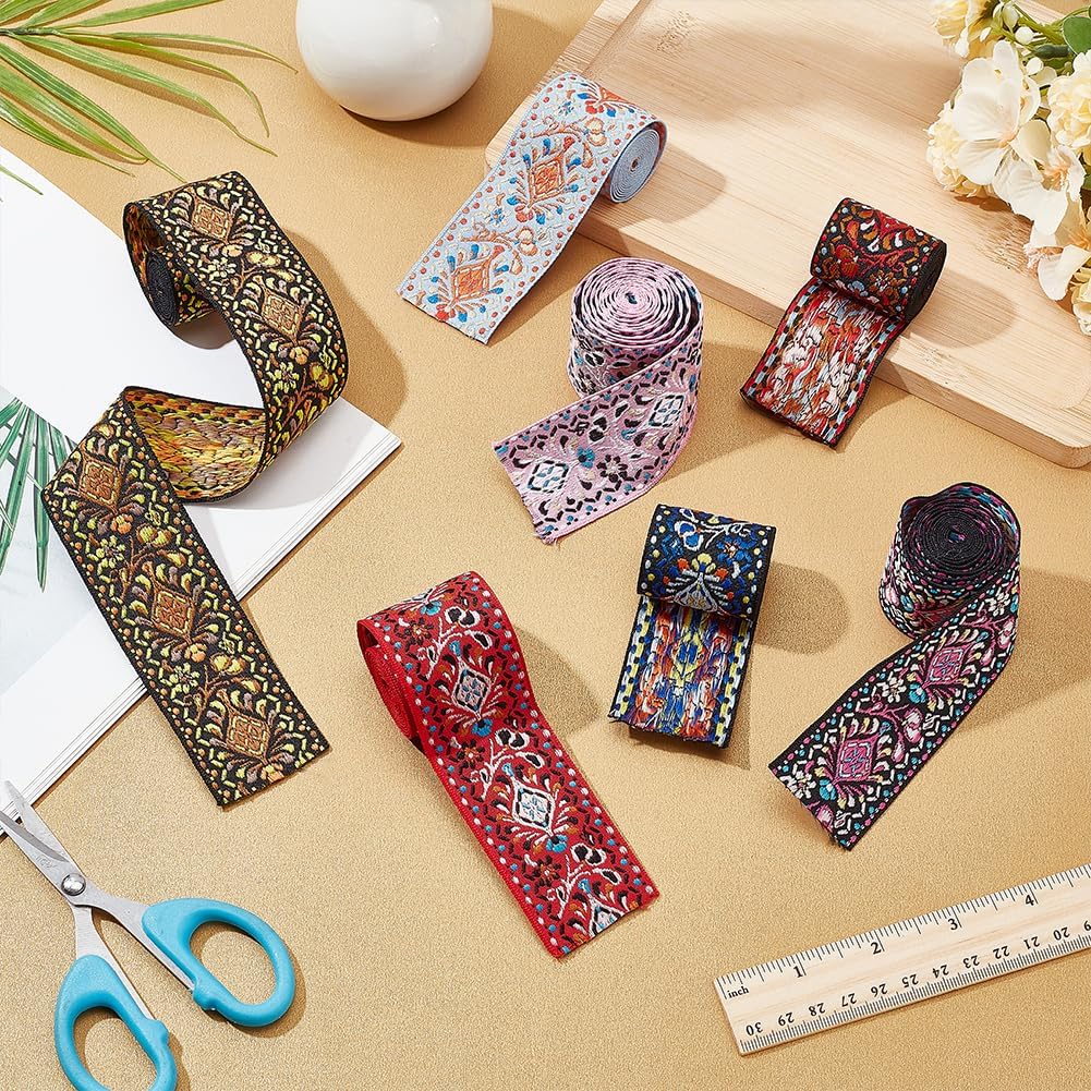 Ribbon size: You will received 7 rolls of flower Jacquard ribbon that all in a bag, about 14 Yards in total length, 2 yards each roll, and 4cm/1.57'' in width. Various color and sufficient length to meet your different needs