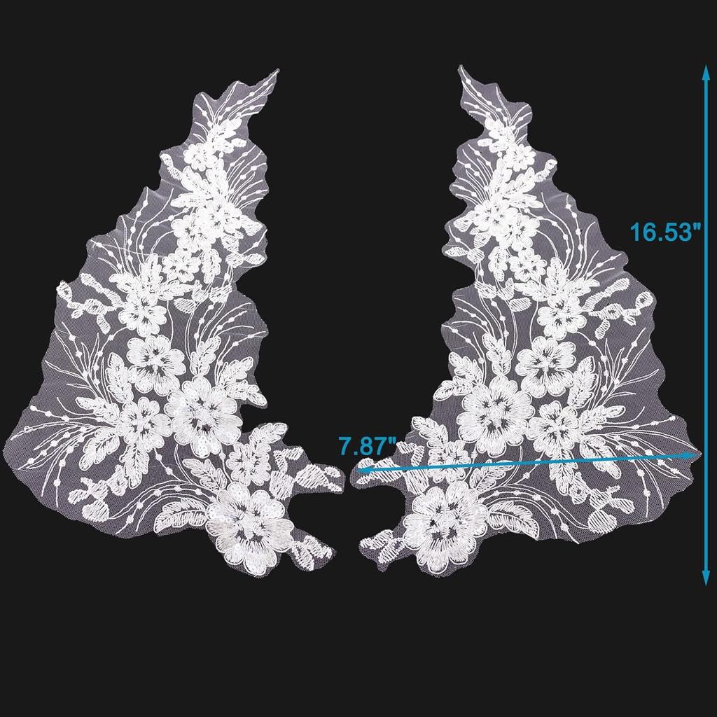 Flower Embroidery Sequin Lace Appliques Trim Floral Embroidered Sew on Patches for Wedding Bridal Dress Party Gown Bodice Craft DIY, 1 Pairs (White)