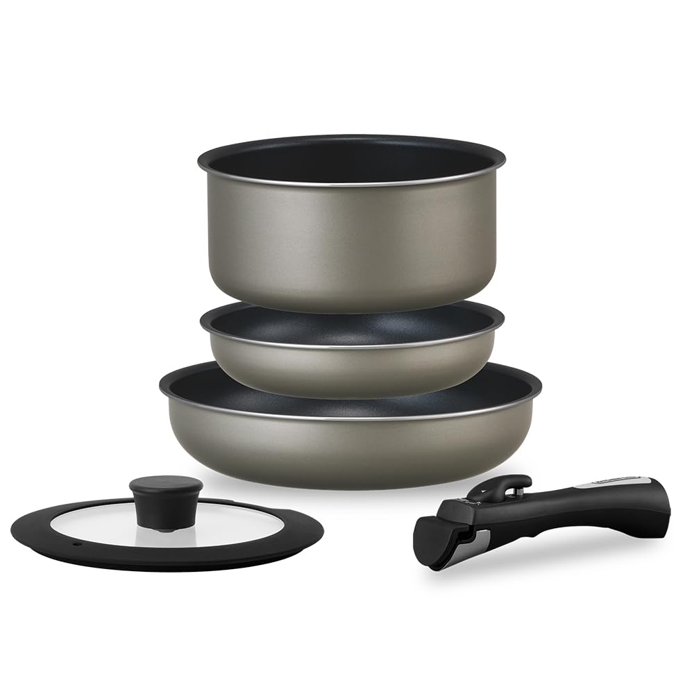 IRIS OHYAMA Bratpfannen- und Topfset, 5-teiliges Set für Ein-Personen-Haushalte, Induktions- und Gasherd-geeignet, Diamantbeschichtet, Silber, mit abnehmbaren Griffen,