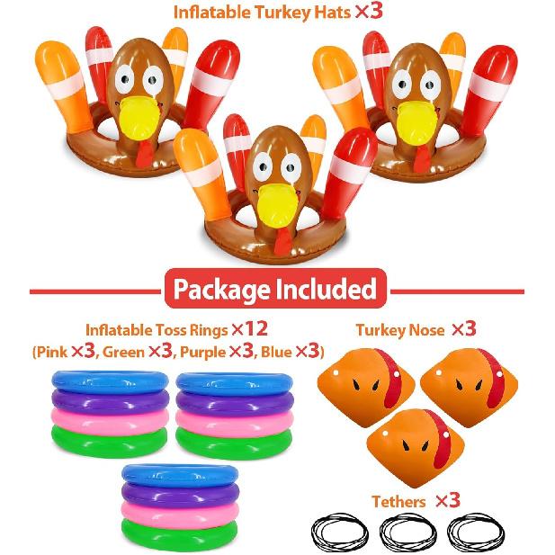 Thanksgiving Inflatable Ring Toss Games: Set included 3 inflatable turkey hats and 12 Inflatable large toss rings (pink x3, red x3, purple x3, blue x3).Unique design Thanksgiving Turkey shaped Ring Toss Games