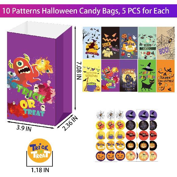 WOONOO 50PCS Halloween Treat Bags Candy Bags for Halloween Party, 10 Styles Paper Halloween Goodie Bags for Party Favors with 50PCS Stickers,