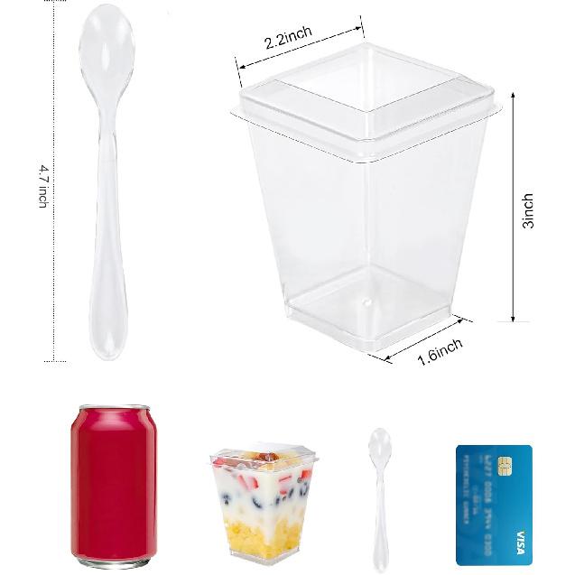 Dessert cups with lids set includes 50 plastic dessert cups, 50 plastic lids and 50 plastic spoons for 50 guests, supporting you with ease for any entertaining and meeting most of your daily needs. Dessert cup size: capacity: 5 oz, cup height: 3 in, cup top length: 2.2 in, cup bottom length: 1.6 in