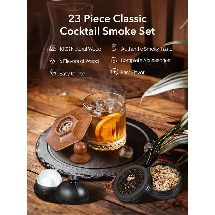【23Pcs Whiskey Gift Set】The cocktail smoker kit is made of high-quality oak wood, which is durable. From a high-end oak wood smoke top, a torch lighter, 12 different natural wood chip flavors, ice molds, metal filter, two Ice Ball Molds, to a beautifully presented gift box, we give you the complete package to enhance your at-home bar and kitchen