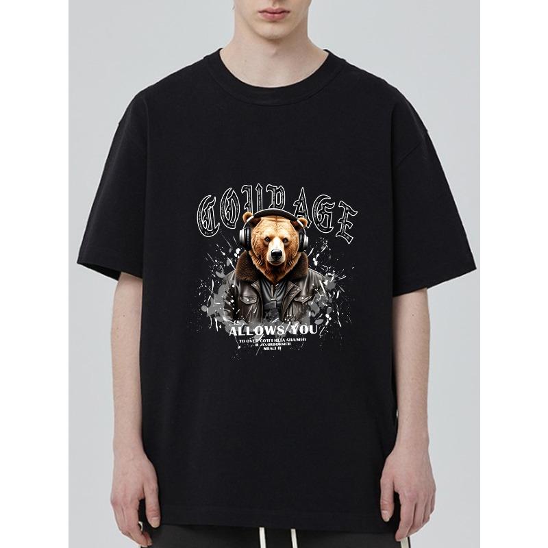 Crewneck T Shirt Black Bear With Headphones And Courage Text Graphic Print Casual Streetwear For Men And Women