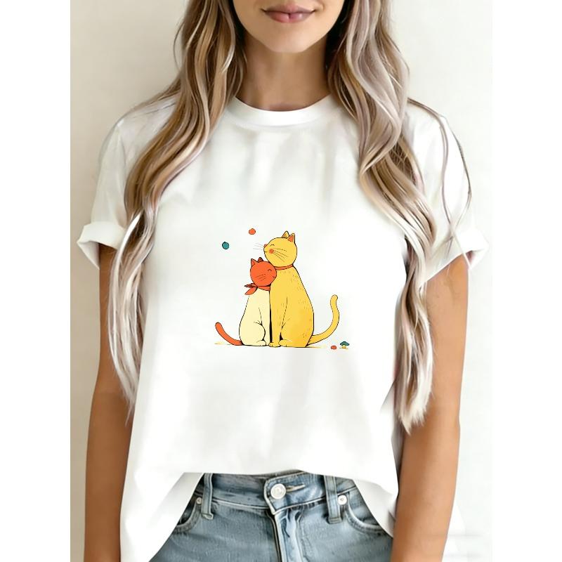 Niedliches Katzenpaar Bedrucktes T-Shirt Weiß Cartoon Katzen Design Für Freizeitkleidung Und Alltagsoutfits