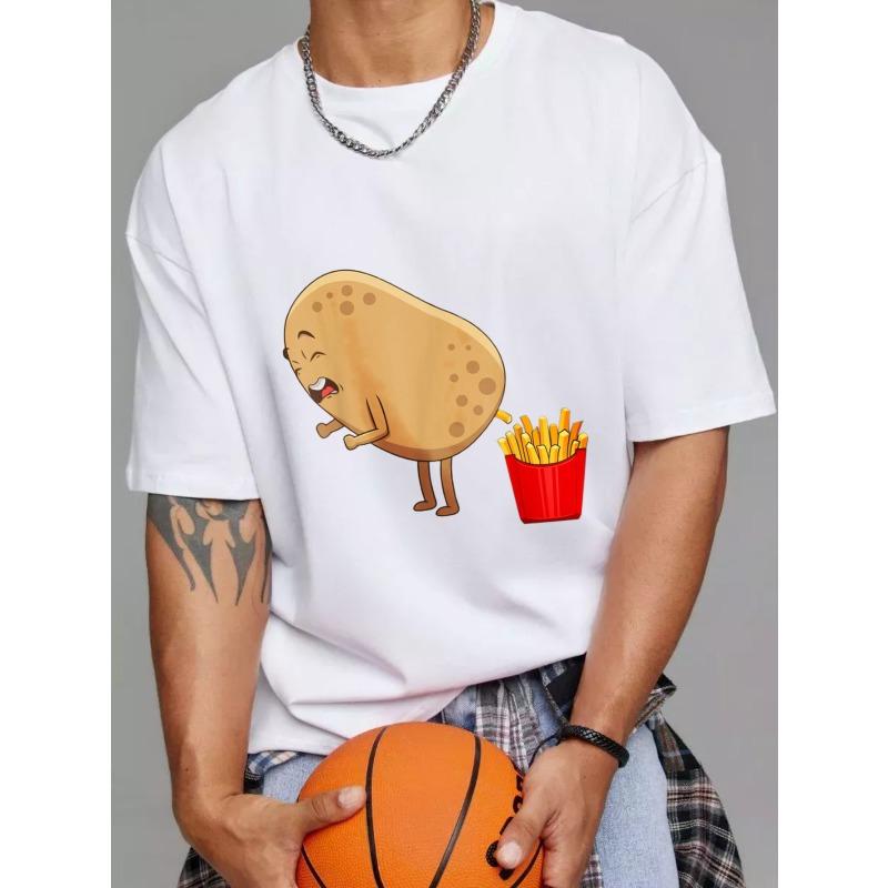 Rundhals T-Shirt Weiß Kartoffel mit Pommes-Frites-Aufdruck Freizeitkleidung für Männer und Frauen Alltagsoutfits Streetwear-Mode Sommerkleidung
