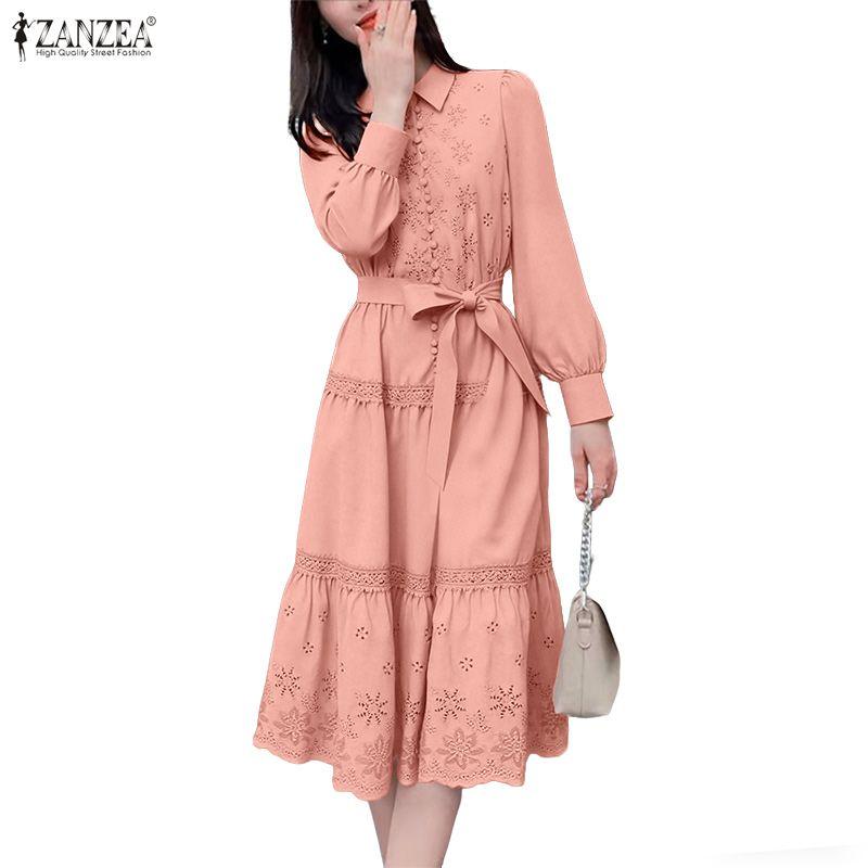 ZANZEA Lässiges Damen-Kleid mit Umlegekragen und langen Ärmeln