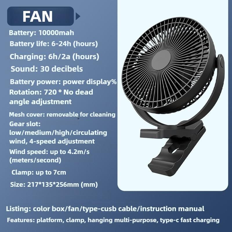 8 inch Potable Large Capacity Desktop Clip-on Office Home Use USB Charging Dormitory Bedside Brushless Electric Fan