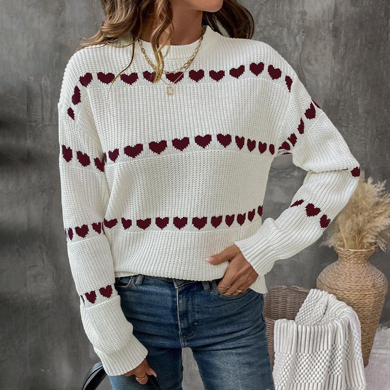 Neuer Herbst- und Winter-Valentinstag-Strickpullover im süßen Stil, lockerer Rundhals-Jacquard-Pullover mit Herzmuster für Damen