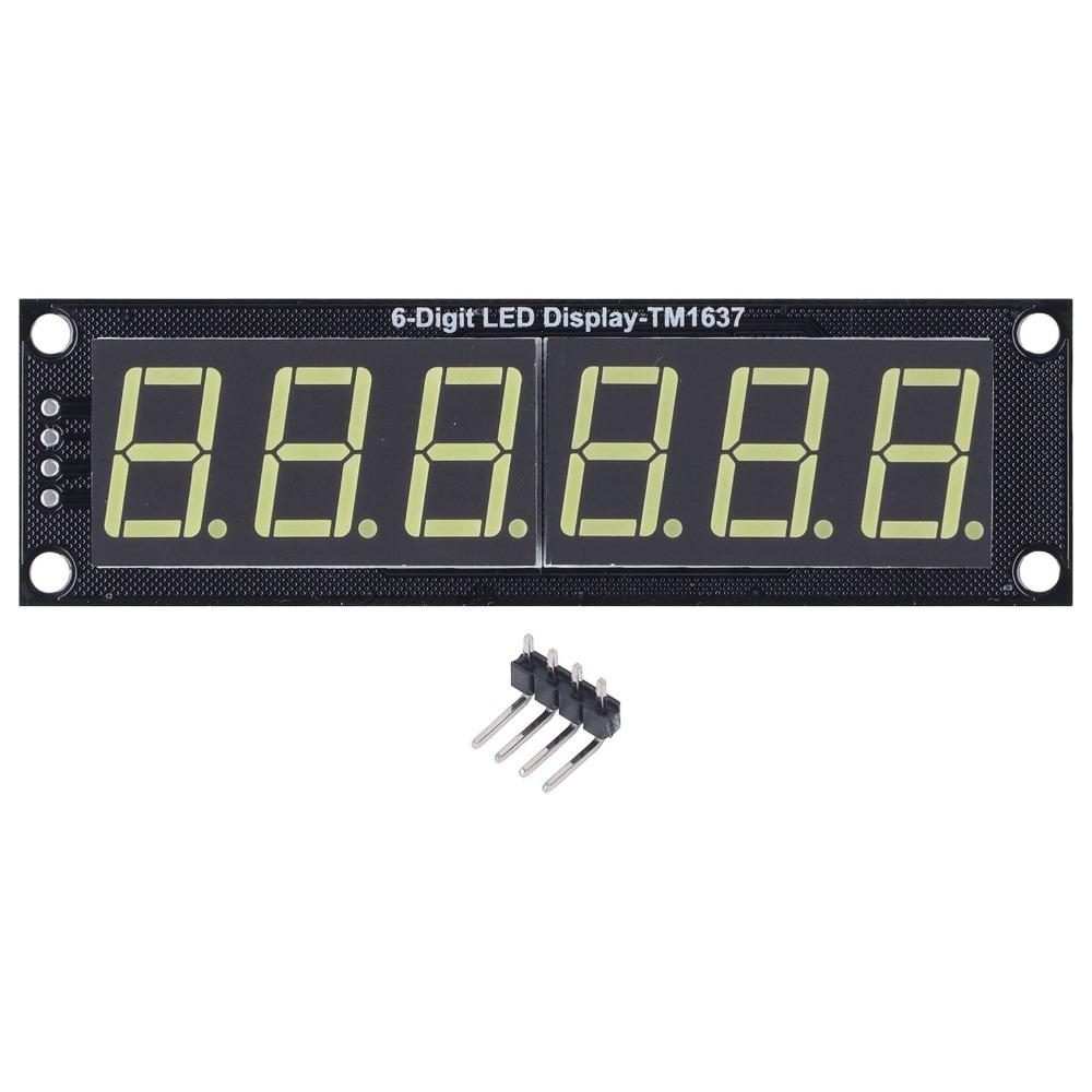 1. 6-Digit Display with TM1637 Driver:This module features a 6-digit, 7-segment LED display, each digit including a decimal point. It uses the TM1637 driver IC and connects via a 2-pin digital interface.