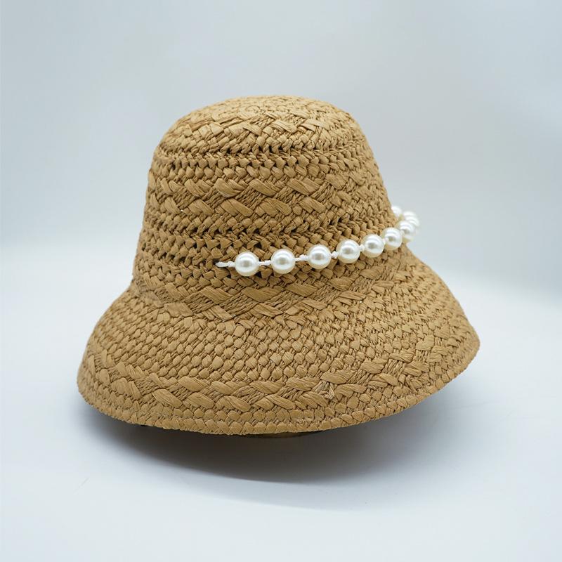 French Japanese Elegant Pearl Chain Woven Bell-Shaped Basin Hat Women'S Summer Sunshade Sunscreen Vacation Beach Hepburn Straw Hat