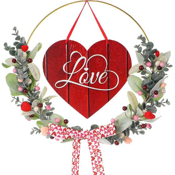 Valentines Day Wreath for Front Door - Cute Valentine Wreaths with Wooden Sweet Heart Love Sign for Wedding Engagement Party, 13 Inch Pink Wreath